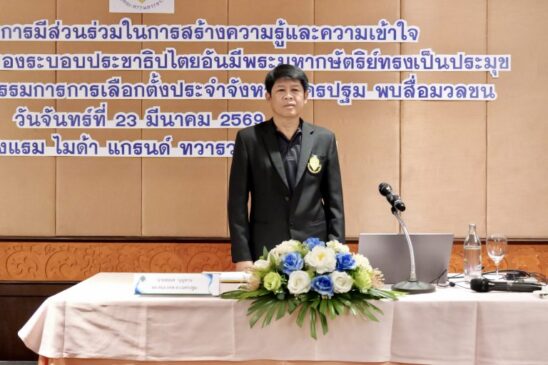 วันจันทร์ที่ ๒๓ มีนาคม ๒๕๖๙ ณ ห้องเจดีย์ ๓ -๔ โรงแรมไมด้า แกรนด์ ทวารวดี นครปฐมอำเภอเมืองนครปฐม จังหวัดนครปฐม สำนักงานคณะกรรมการการเลือกตั้งประจำจังหวัดนครปฐม จัดกิจกรรมสำนักงาน กกต.จังหวัด พบสื่อมวลชน ได้รับเกียรติจาก นายสมยศ บุญทาน ผู้อำนวยการสำนักงานคณะกรรมการการเลือกตั้งประจำจังหวัดนครปฐม เป็นประธานกล่าวเปิดกิจกรรม และนางเกษสินี โชติกเสถียร รองผู้อำนวยการสำนักงานคณะกรรมการการเลือกตั้งประจำจังหวัดนครปฐม กล่าวรายงานวัตถุประสงค์